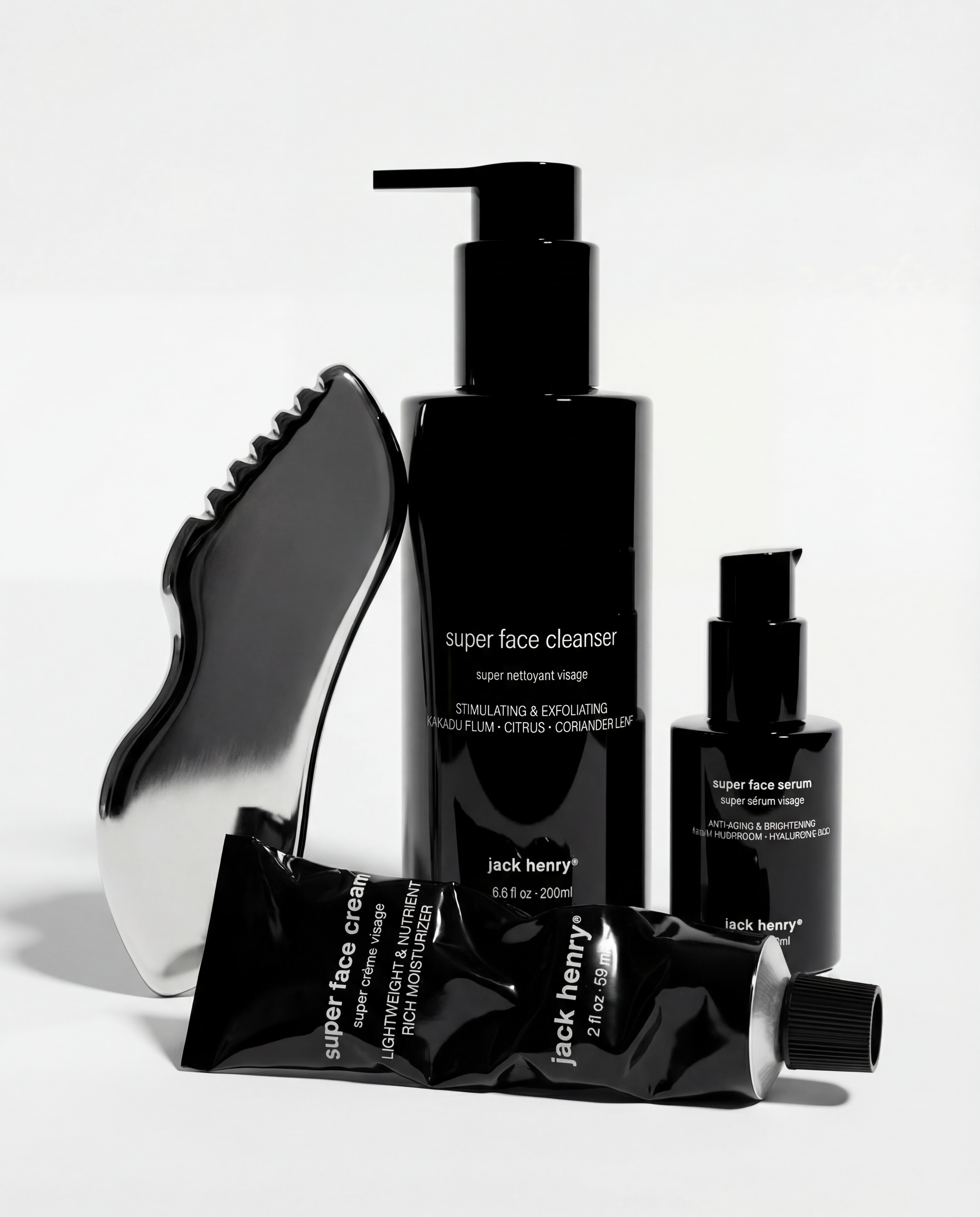 The Super Face Kit includes three full-size products—Super Face Cleanser (6.6 oz), Super Face Serum (1 oz), and Super Face Cream (1.7 oz)—which form a complete, professional-grade skincare system. This is the Jack Henry Super Face System: cleanse with enzyme-rich exfoliation, treat with bioactive anti-aging ingredients, and seal with nutrient-dense hydration. Together, they work synergistically to cleanse impurities, refine pores, stimulate collagen, balance oil production, combat hyperpigmentation, and protect against environmental aging. It's designed as a morning and night routine that addresses dryness, dullness, fine lines, uneven texture, and early signs of aging—all in three simple steps.